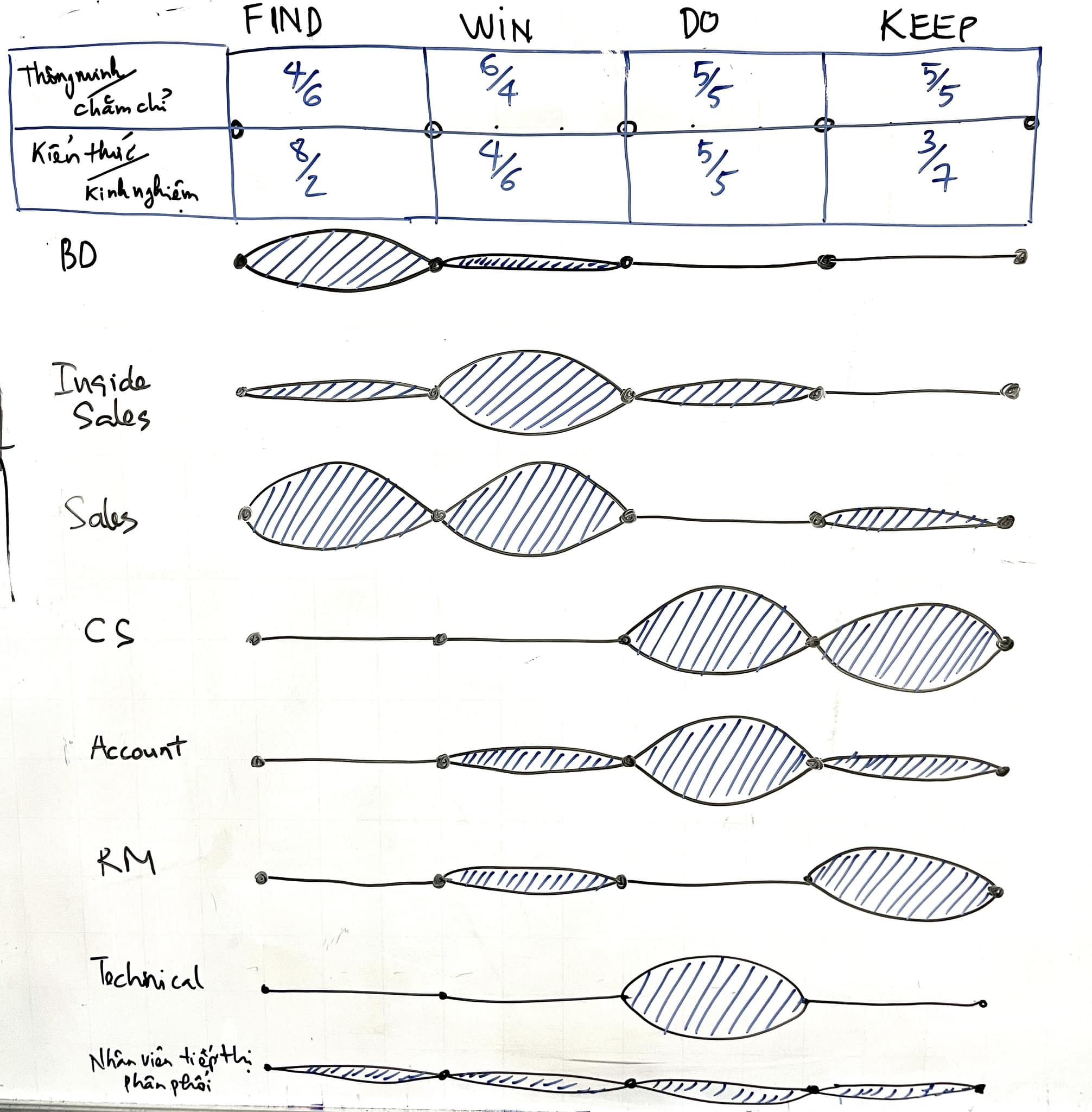 - KEEP: cặp năng lực thông minh và chăm chỉ vẫn nên cân bằng, nhưng kinh nghiệm chiếm lợi thế hơn hẳn so với kiến thức. Sự thấu hiểu khách hàng, niềm tin của khách hàng luôn cần thời gian, vì vậy nhóm sales già có lợi thế hơn hẳn so với sales non trong trường hợp này.