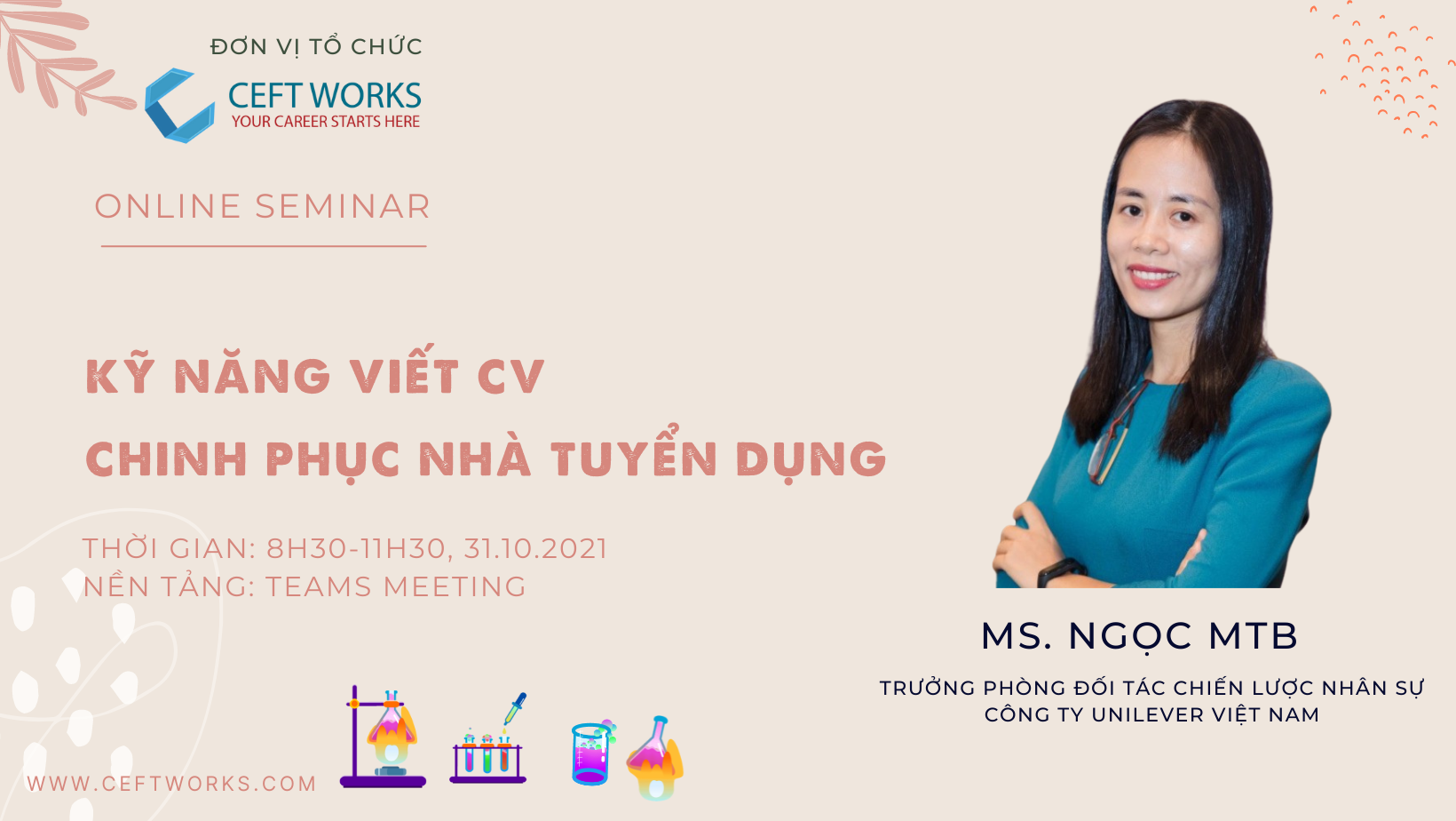 Nhằm nâng cao năng lực tìm việc cho sinh viên khối ngành kỹ thuật thông qua việc chuẩn bị 1 chiếc CV tìm việc thật chỉnh chu và chuyên nghiệp, #CEFTworks rất vinh dự được chị Ngọc MTB – Trưởng Phòng Đối Tác Chiến Lược Nhân Sự, công ty Unilever Việt Nam đồng hành chia sẻ. Với kinh nghiệm hơn 12 năm trong lĩnh vực Nhân Sự, Chị Ngọc sẽ chia sẻ những điểm chạm cần có trong 1 chiếc CV từ góc nhìn của nhà Tuyển dụng, nhằm giúp các bạn sinh viên và người đang công tác trong lĩnh vực kỹ thuật tăng lợi thế hơn trong mắt nhà tuyển dụng.