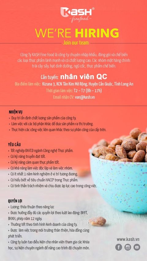 Công Ty KASH Fine Food là công ty chuyên nhập khẩu, đóng gói và chế biến các loại thực phẩm lành mạnh và có chất lượng cao. Các nhóm mặt hàng chính: trái cây sấy, hạt dinh dưỡng, ngũ cốc, thực phẩm chế biến.