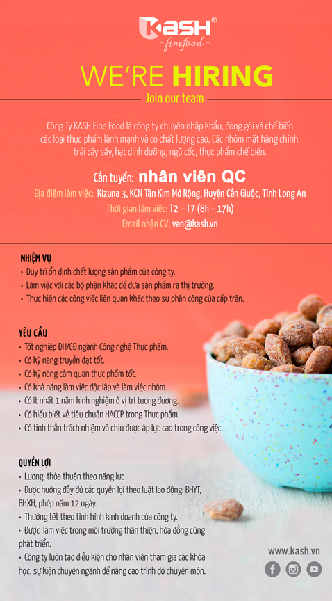 Công Ty KASH Fine Food là công ty chuyên nhập khẩu, đóng gói và chế biến các loại thực phẩm lành mạnh và có chất lượng cao. Các nhóm mặt hàng chính: trái cây sấy, hạt dinh dưỡng, ngũ cốc, thực phẩm chế biến.