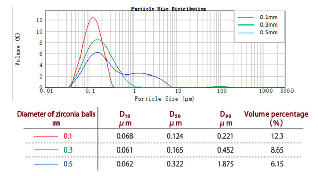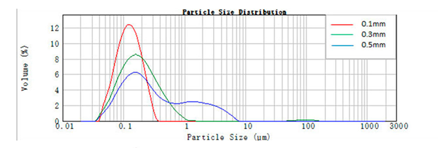 - So sánh ba mẫu bột tương ứng với ba kích thước bi nghiền khác nhau trên cùng biểu đồ. Kết quả cho thấy mẫu 0.1mm chứa các hạt có độ đồng đều về kích thước hơn hai mẫu còn lại